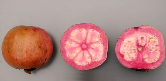 Guava fruit generally have a pronounced and typical fragrance, similar to lemon rind but less sharp. Guava pulp may be sweet or sour, off-white ("white" guavas) to deep pink ("red" guavas), with the seeds in the central pulp of variable number and hardness, again depending on species.