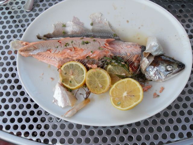 | 1 | whole fish, about 2-3 lb. (try trout, Bronzino, red snapper, whatever is fresh) | | Thyme sprigs | | Dill | | Lemon slices | | Olive oil | | Sea salt | | Pepper |