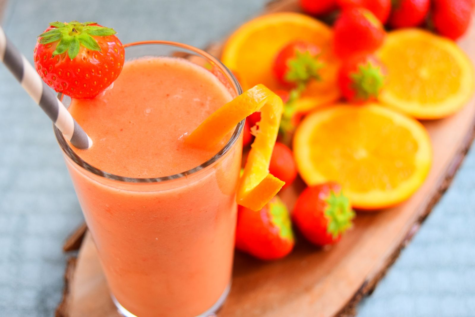 1.Place the bananas and chopped and de-stemed strawberries in a blender with the orange juice and blitz until smooth and delicious.